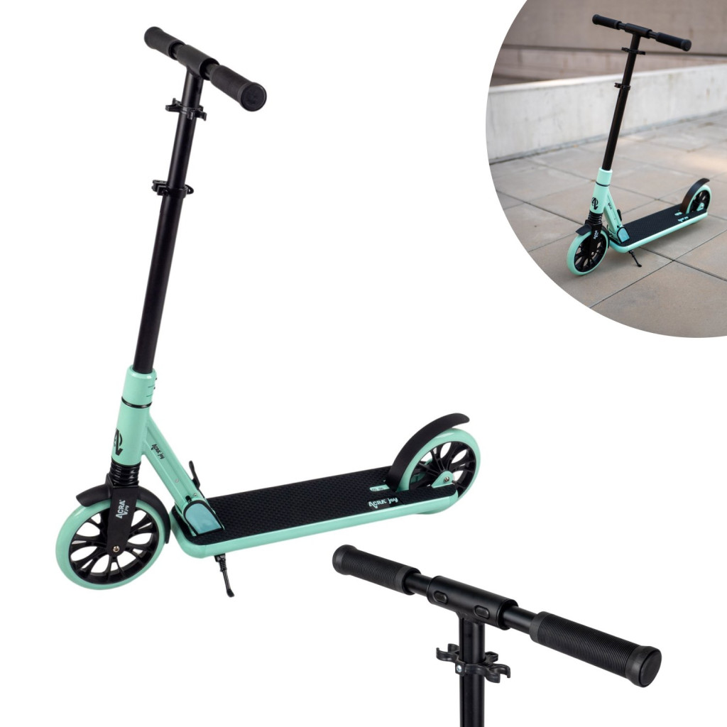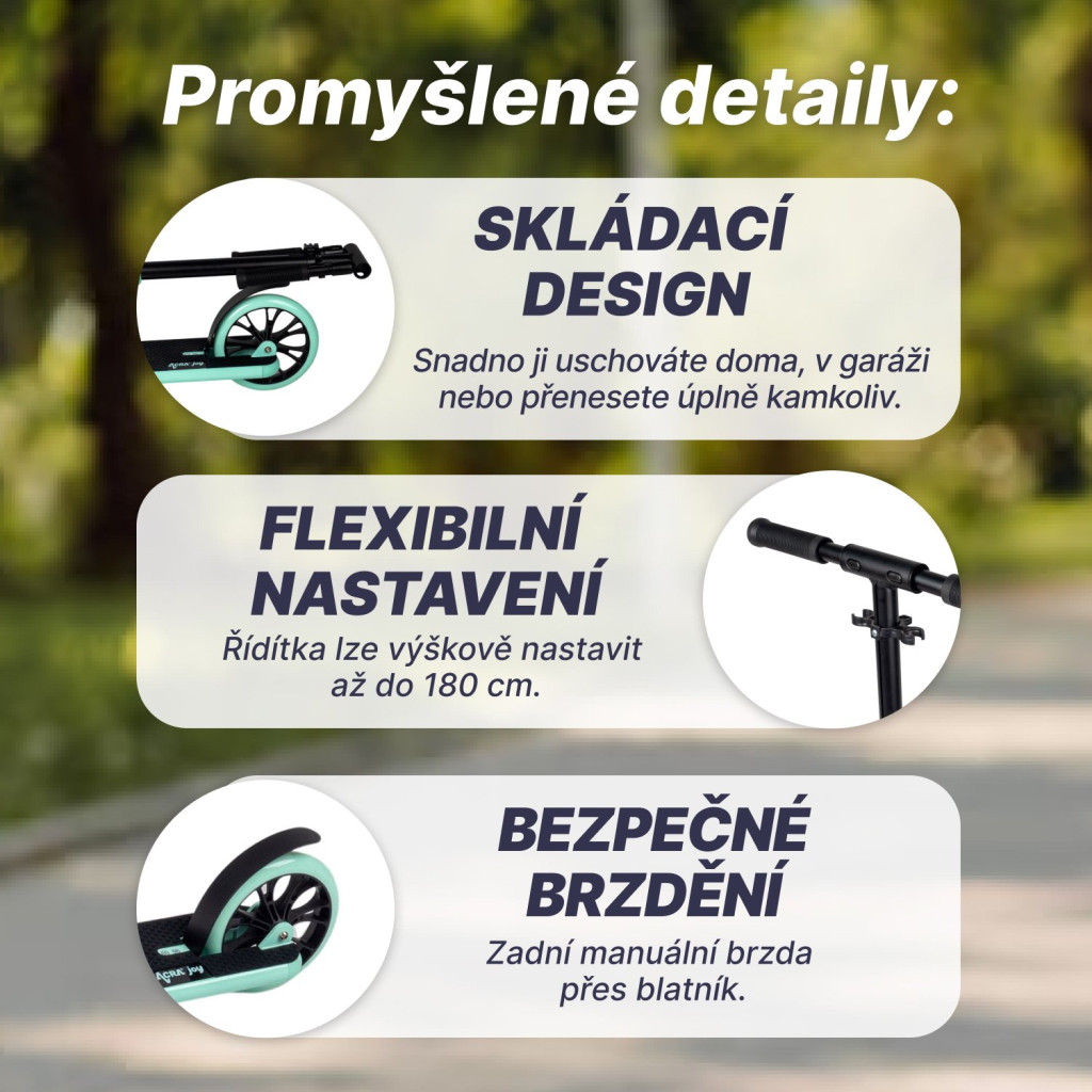 Összecsukható roller 100 kg terhelhetőséggel, ajánlott magasság 180 cm-ig, 9 éves kortól, 200 mm átmérőjű gumikerekek, minőségi könnyű acél, hátsó kézifék, állítható kormány gumikarokkal.