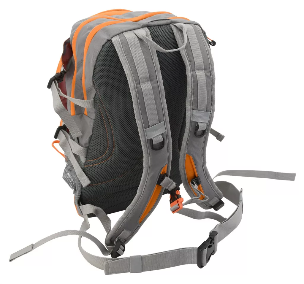 Outdoor hátizsák, 30 l űrtartalom, két fő cipzáras zseb, elülső cipzáras zseb, kötős rendszer az apróságokra, oldalsó hálós zsebek, használható ivózsákra, szellőzött és bélelt pántok és hátsó rész. Szürke-narancssárga szín.