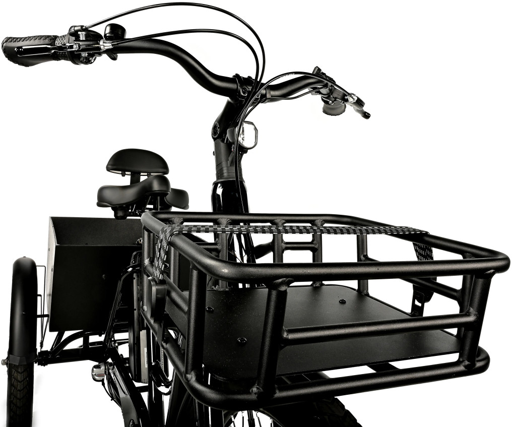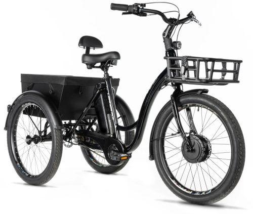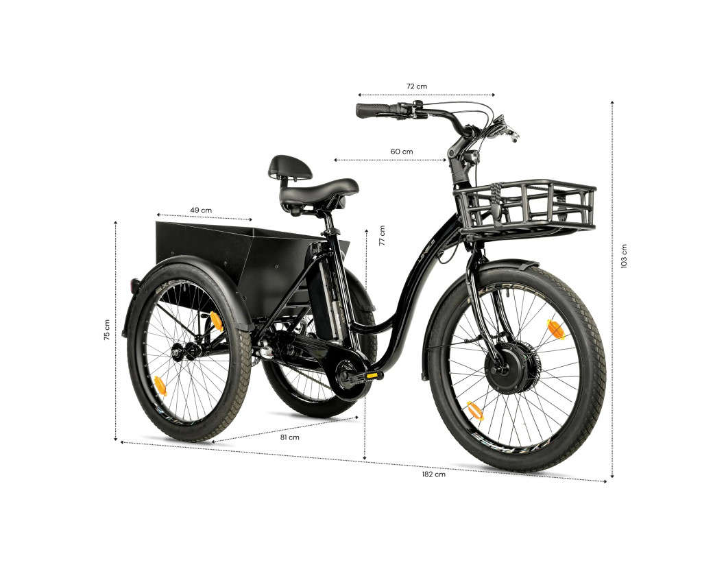 Elektromos tricikli, váz 18„, kerékméret 24”, 3 sebesség, ajánlott kerékpáros magasság 155-185 cm, mechanikus tárcsafék, terhelhetőség 120 kg, fekete szín. 5 támogatási mód, jól látható LCD kijelző.