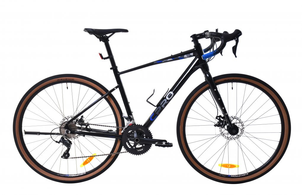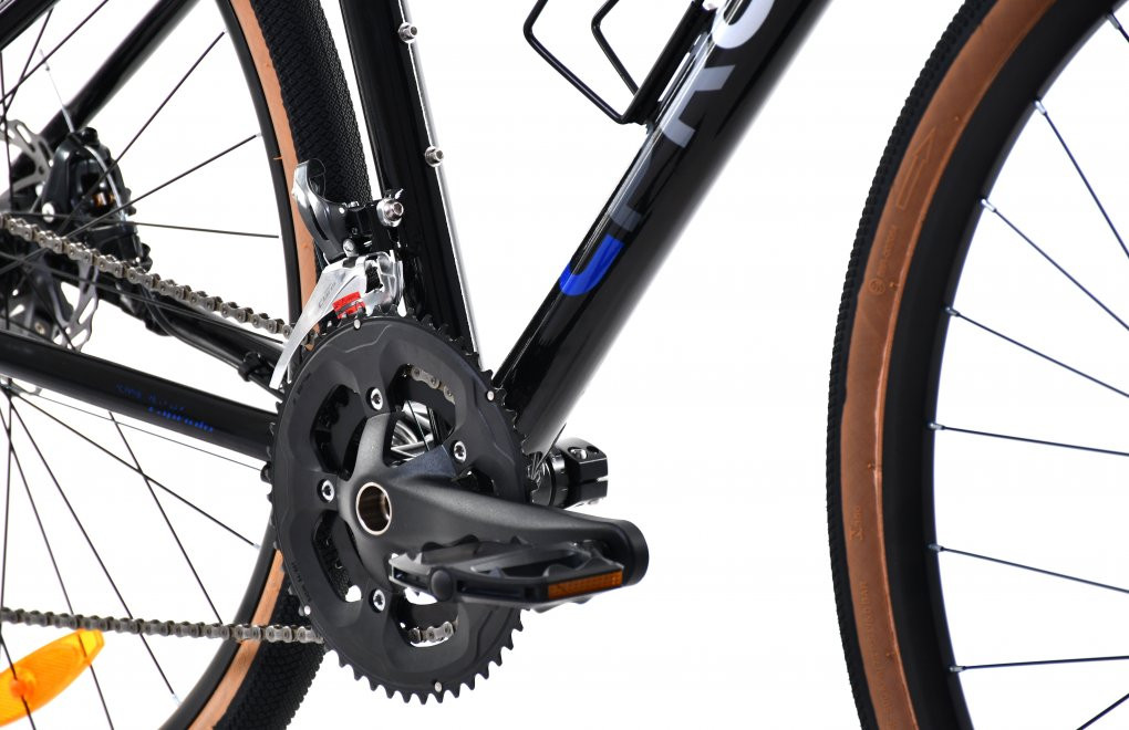Gravel bike, váz 53, kerékméret 28", 18 sebességes (2 x 9), ajánlott kerékpáros magasság 170-185 cm, első és hátsó Shimano váltó, tárcsafékek, terhelhetőség 110 kg-ig, szín fekete.