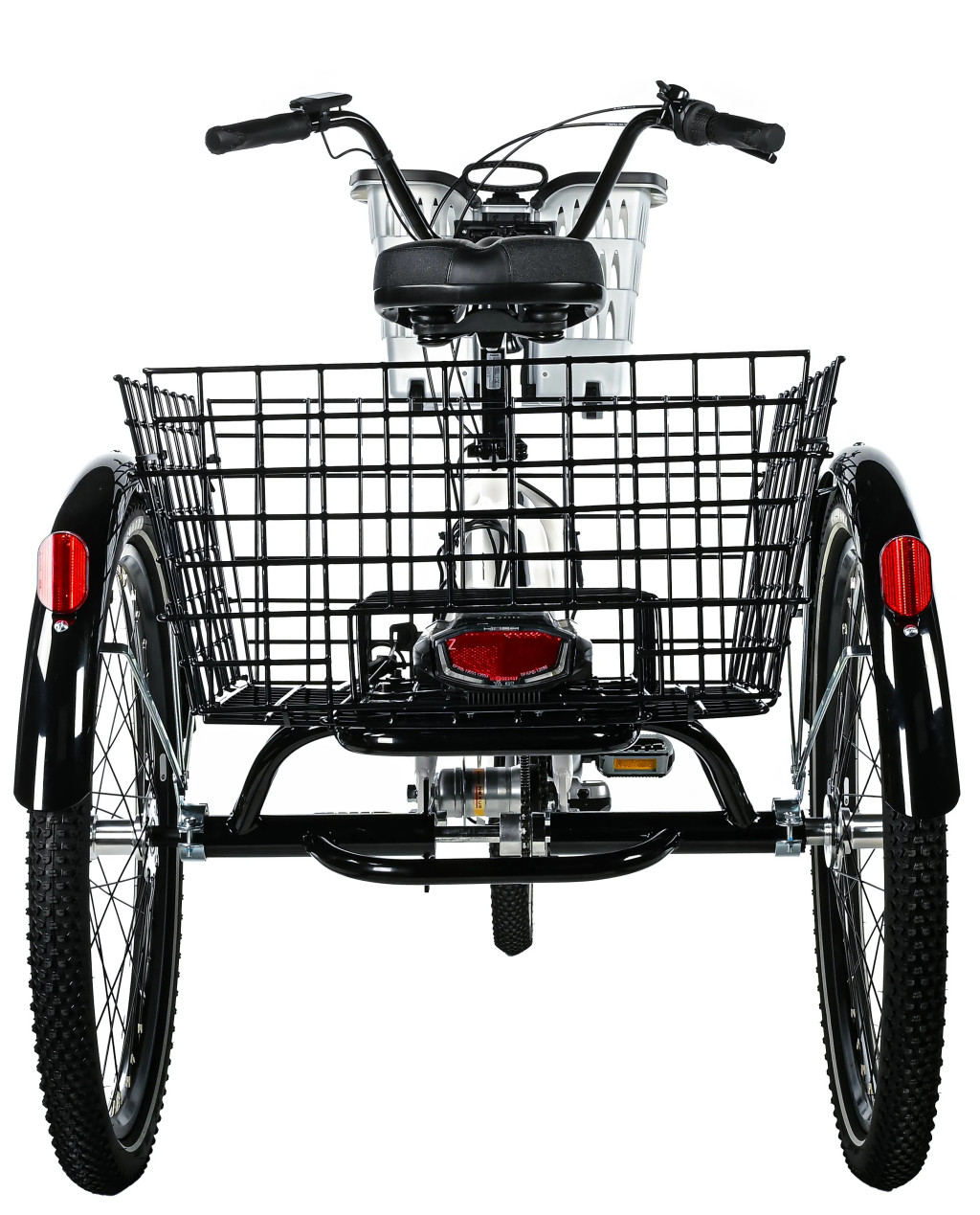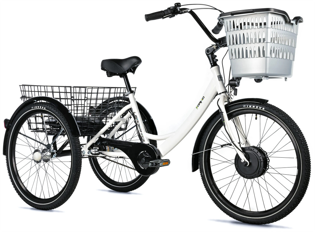 Elektromos háromkerekű kerékpár, 18"-os váz, 24"-os kerekek, 250 W teljesítményű első BAFANG motor, mechanikus tárcsafékek, akár 70 km hatótáv, 120 kg teherbírás, fehér szín.
