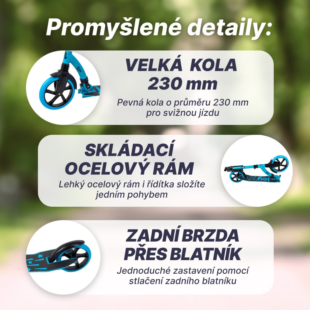Robogó 100 kg terhelhetőséggel, ajánlott magasság 170 cm-ig, 9 éves kortól, kerékméret 230 mm, minőségi könnyű acél, kézifék a hátsó sárvédőnél, gumi fogantyúk.