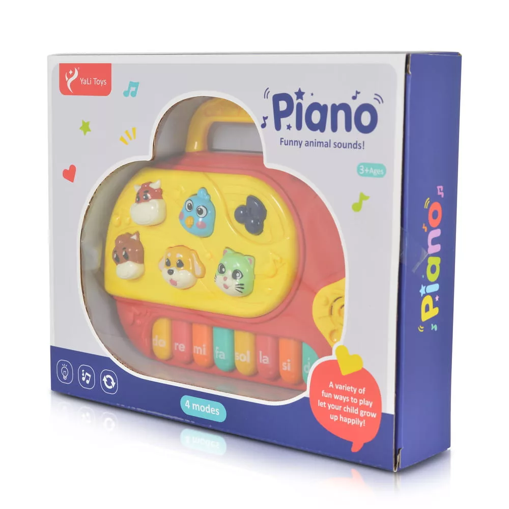 Kinderklavier aus Kunststoff für Kinder ab 3 Jahren mit lustigen Tiergeräuschen und 4 Musikmodi. Größe: 26 x 5 x 21 cm. Verpackungsgröße: 26,5 x 5,5 x 21,5 cm. Gewicht: 0,28 kg.