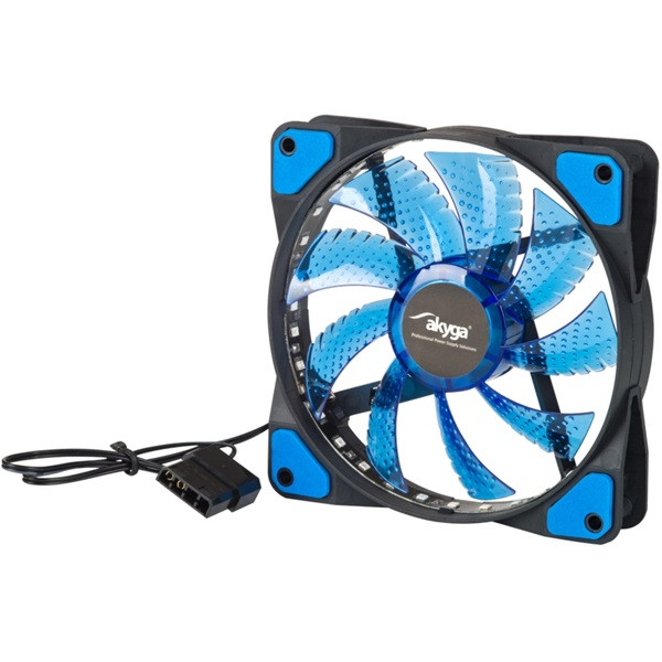 Az Akyga® AW-12E-BL kiváló minőségű számítógép-ventilátor. Az okosan megtervezett pengék a rezgéscsillapítókkal együtt pozitívan befolyásolják a ventilátor csendes működését. A tartós hüvelycsapágyak nagyon hosszú és problémamentes működést biztosítanak a legnagyobb sebességgel. Továbbá a termék integrált kék LED-es megvilágítással rendelkezik. Ennek köszönhetően a ventilátor használható az ATX ház belső megjelenítésére is.