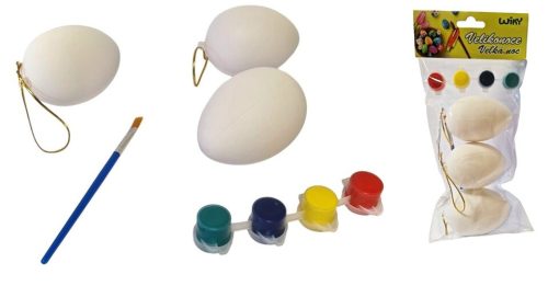 A csomagban 3db színezhető tojást találsz, amit felakaszthatsz, vízfestékeket, ecsetet.