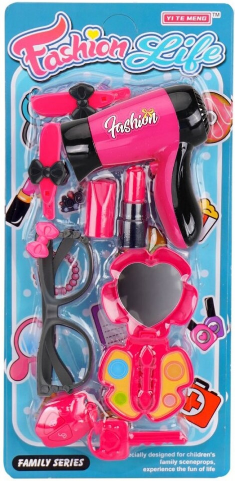 Rózsaszín szett kis szépségeknek. A szépség szett tartalma: 2x hajcsat, szemüveg, műanyag kifestő szett, hajszárító, autókulcsok.