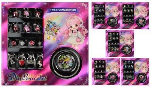 A készlet tartalma: karkötők készítéséhez szükséges kiegészítők keveréke. Mindegyik műanyagból készült. A készlet különböző színekben és különböző formákban és textúrákban kapható, hatféle variációban.