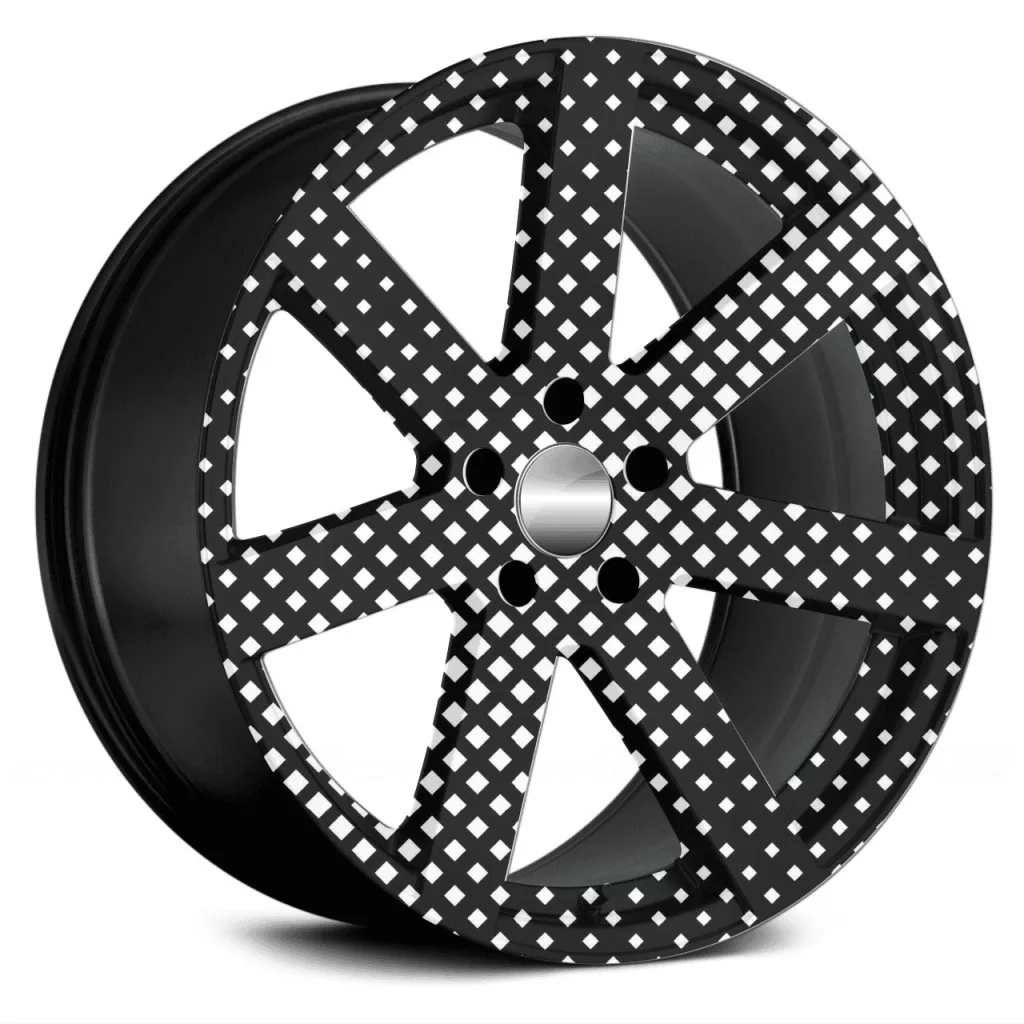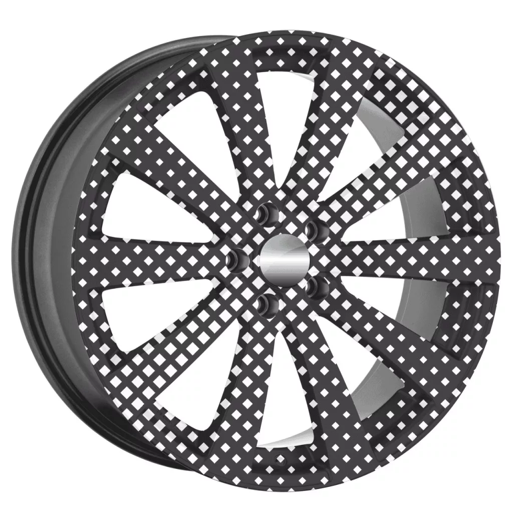 Autófólia készlet felnicsomagoláshoz, kiváló minőségű, kültéri oldószerekkel nyomtatott termék, tartós kültéri használatra, tuningrajongóknak, autóversenyeknek, autókiállításoknak ajánljuk. A termék mérete (Ø 60 cm) elegendő akár 21"-es felnik ragasztásához.