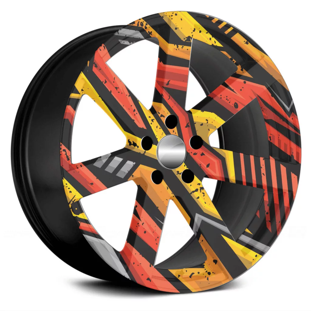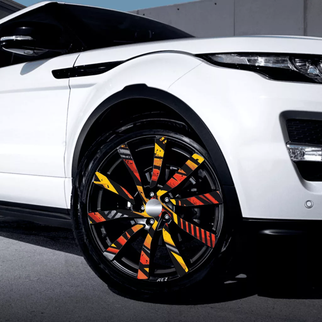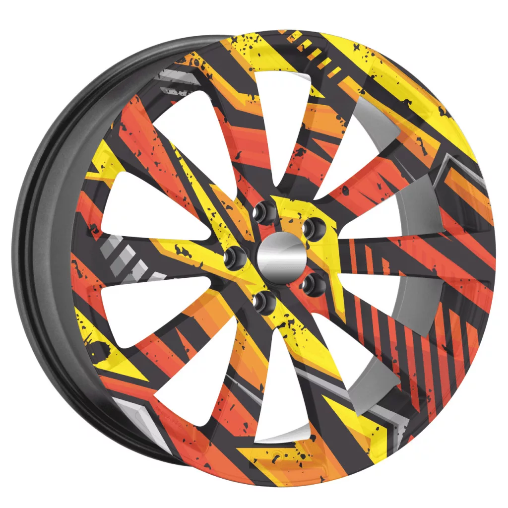 Autófólia készlet felnicsomagoláshoz, kiváló minőségű, kültéri oldószerekkel nyomtatott termék, tartós kültéri használatra, tuningrajongóknak, autóversenyeknek, autókiállításoknak ajánljuk. A termék mérete (Ø 60 cm) elegendő akár 21"-es felnik ragasztásához.