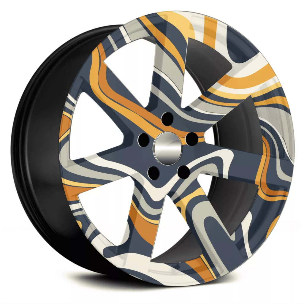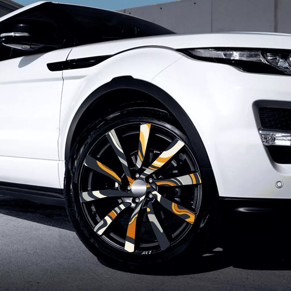 Autófólia készlet felnicsomagoláshoz, kiváló minőségű, kültéri oldószerekkel nyomtatott termék, tartós kültéri használatra, tuningrajongóknak, autóversenyeknek, autókiállításoknak ajánljuk. A termék mérete (Ø 60 cm) elegendő akár 21"-es felnik ragasztásához.