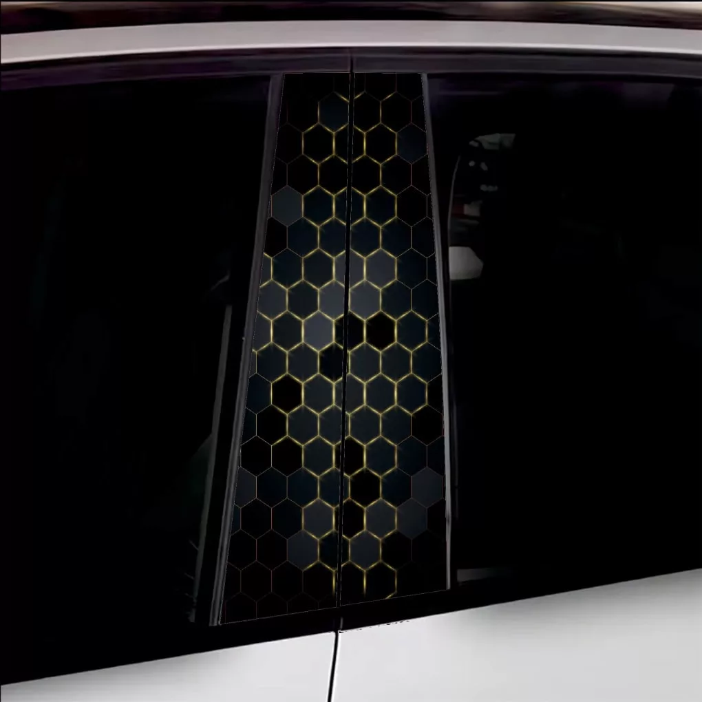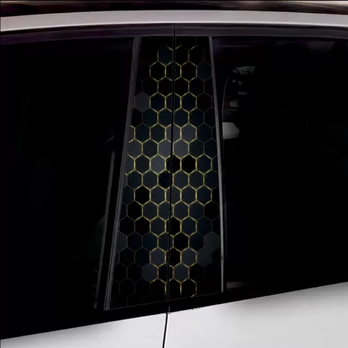 2 db kültéri nyomtatott fólia készlet autó ajtóoszlopainak ragasztásához. Az EcoSolvent Outdoorral nyomtatott fólia bármilyen sík, sima felületre tapad. Durva felületek esetén a termék tapadása jelentősen csökken.