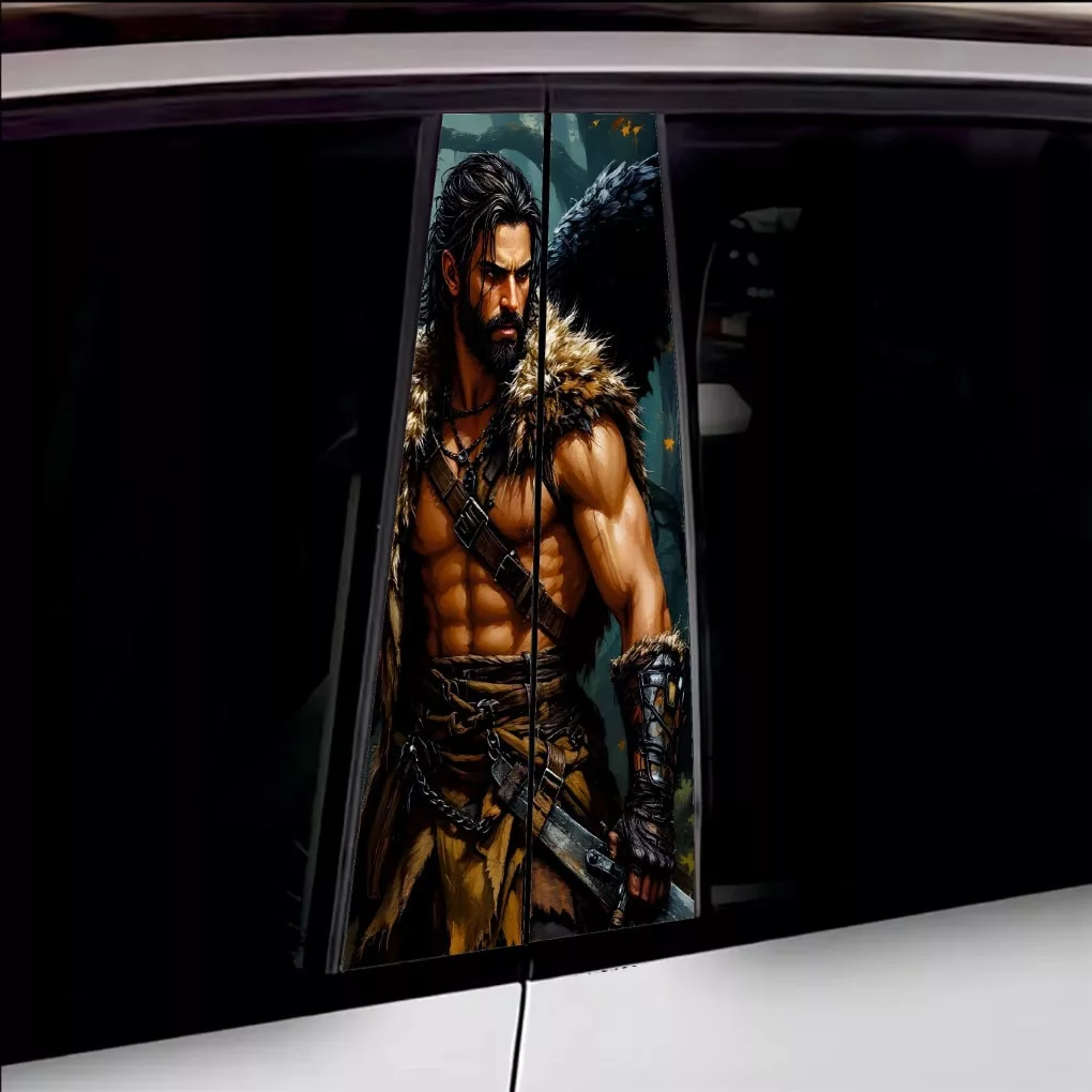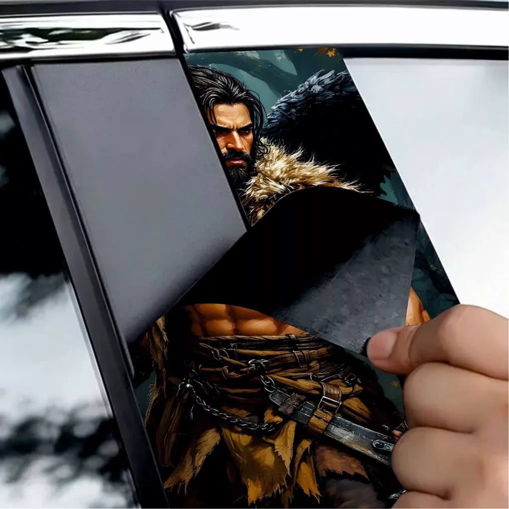 2 db kültéri nyomtatott fólia készlet autó ajtóoszlopainak ragasztásához. Az EcoSolvent Outdoorral nyomtatott fólia bármilyen sík, sima felületre tapad. Durva felületek esetén a termék tapadása jelentősen csökken.