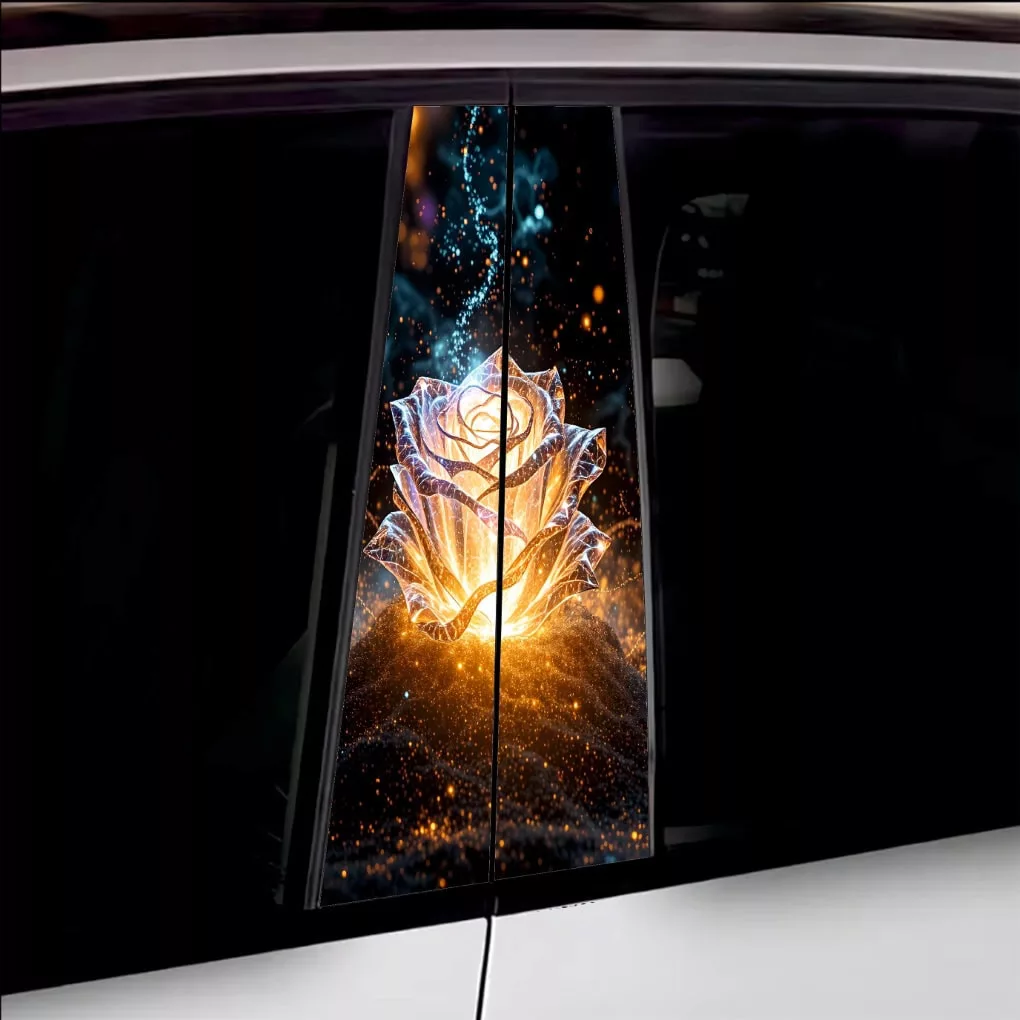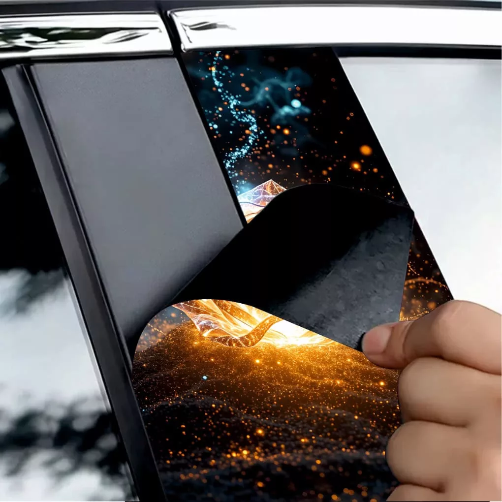 2 db kültéri nyomtatott fólia készlet autó ajtóoszlopainak ragasztásához. Az EcoSolvent Outdoorral nyomtatott fólia bármilyen sík, sima felületre tapad. Durva felületek esetén a termék tapadása jelentősen csökken.