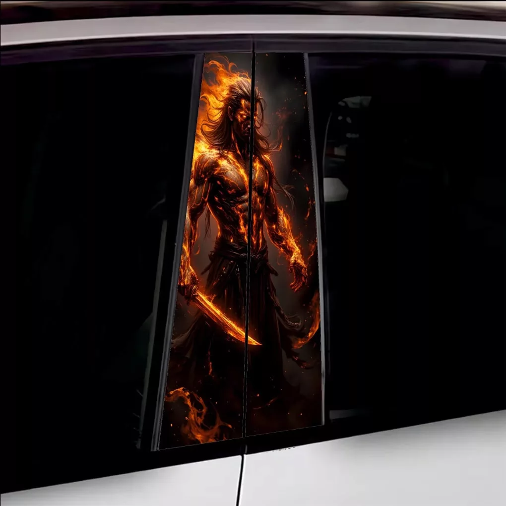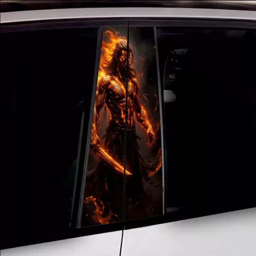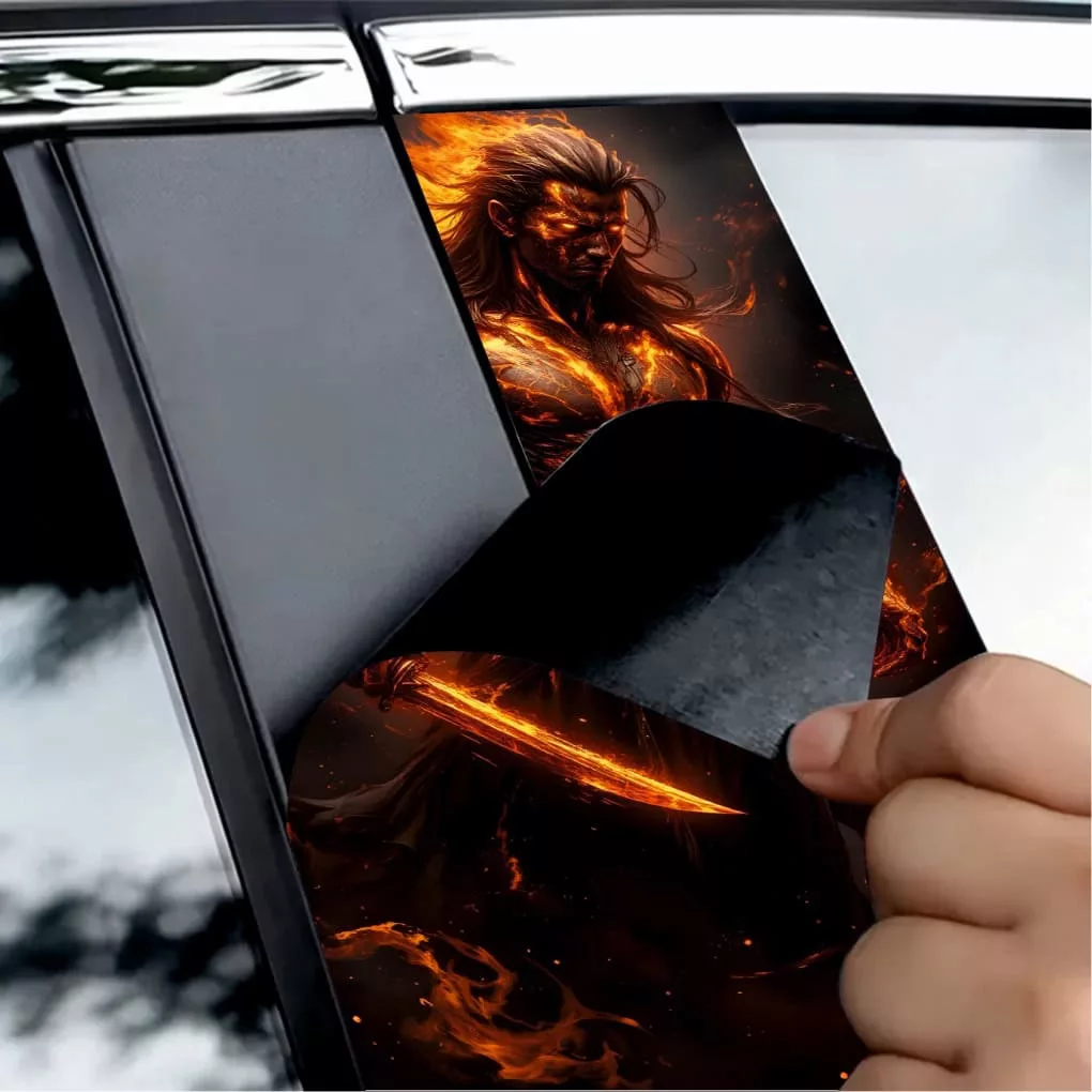 2 db kültéri nyomtatott fólia készlet autó ajtóoszlopainak ragasztásához. Az EcoSolvent Outdoorral nyomtatott fólia bármilyen sík, sima felületre tapad. Durva felületek esetén a termék tapadása jelentősen csökken.