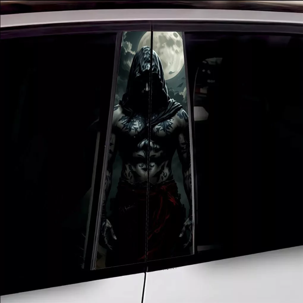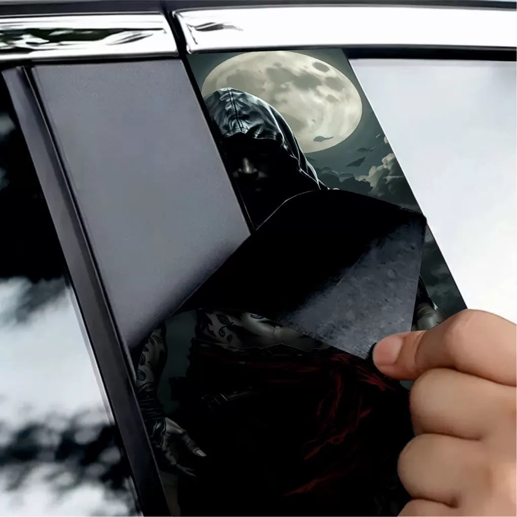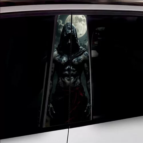 2 db kültéri nyomtatott fólia készlet autó ajtóoszlopainak ragasztásához. Az EcoSolvent Outdoorral nyomtatott fólia bármilyen sík, sima felületre tapad. Durva felületek esetén a termék tapadása jelentősen csökken.