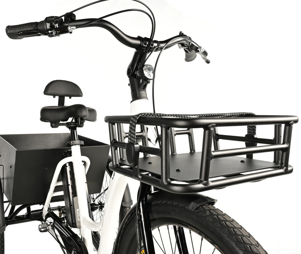 Elektromos tricikli, váz 18„, kerékméret 24”, 3 gyorsasági fokozat, ajánlott kerékpáros magasság 155-185 cm, mechanikus tárcsafék, terhelhetőség 120 kg, szín fehér.