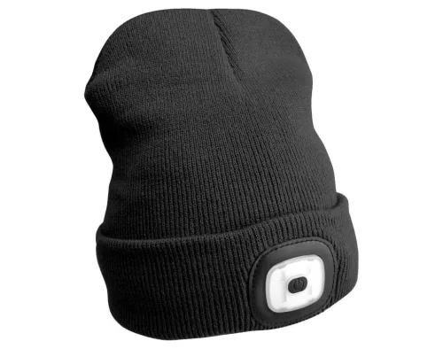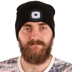 Sapka LED fejlámpával, beépített LED lámpa 180 lm (4x45 lm) fényerővel, 3 világítási mód - 50%, 75% és 100%, akkumulátor élettartama akár 4 óra, a fejlámpa eltávolítható és a sapka mosható, hátul fényvisszaverő, egyszerű töltés USB-n keresztül, fekete.